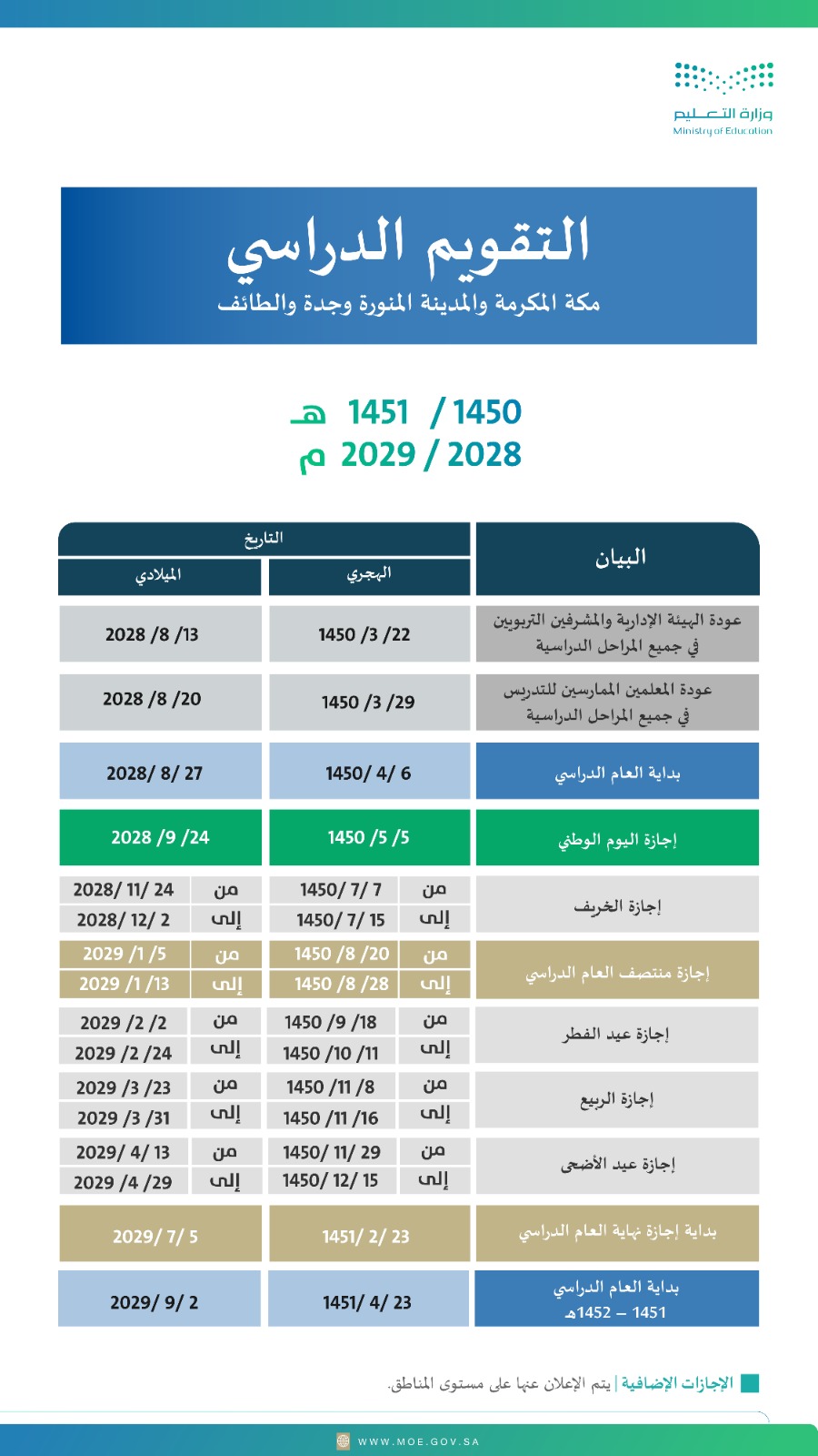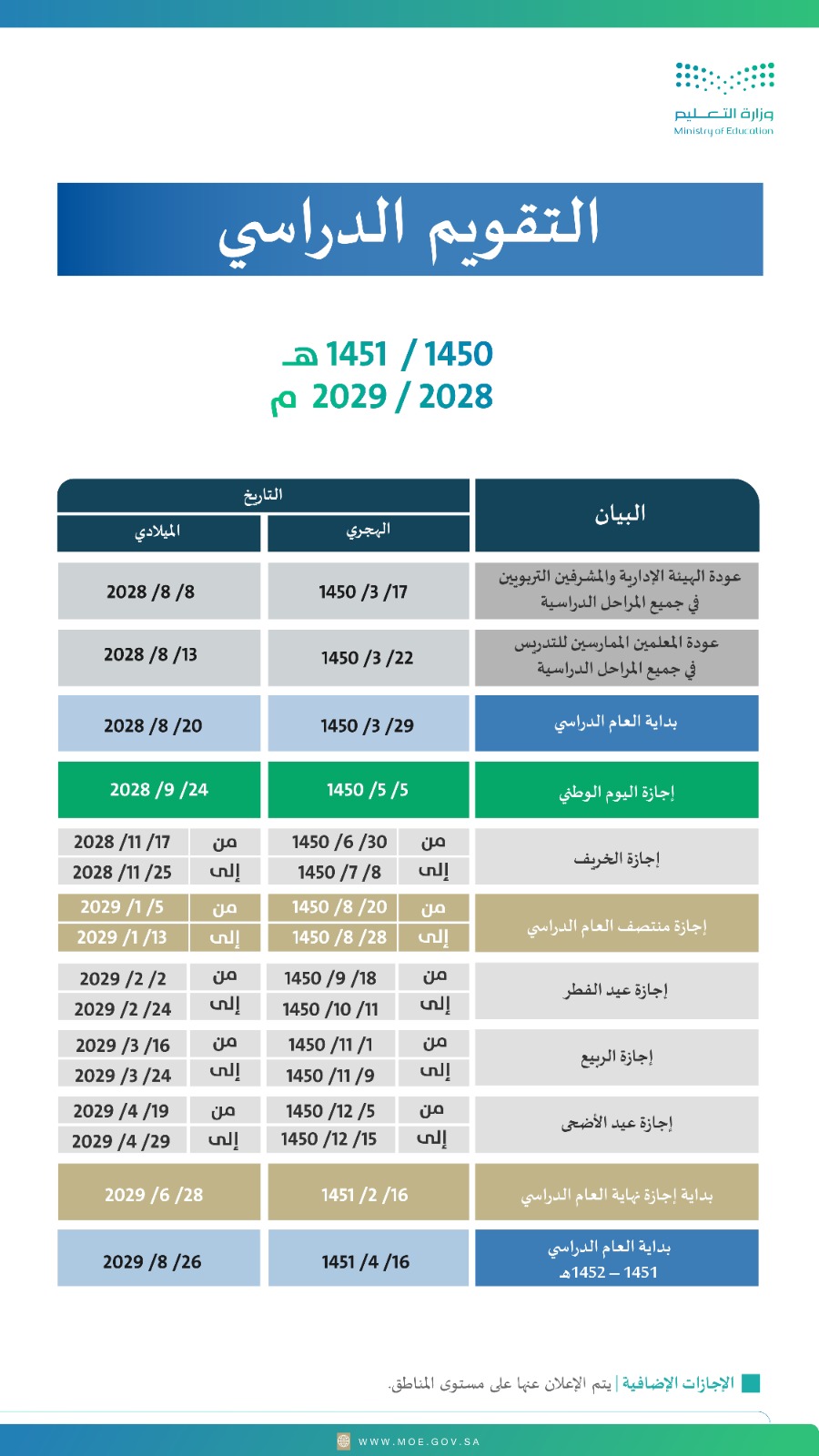 التقويم الدراسي للعام 1450-1451 الموافق 2028-2029