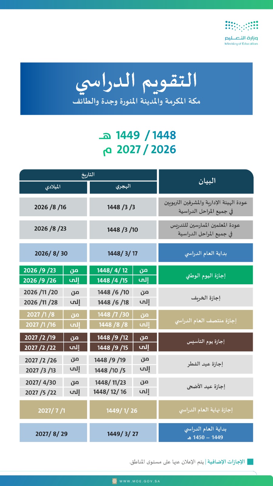 التقويم الدراسي للعام 1448-1449 الموافق 2026-2027